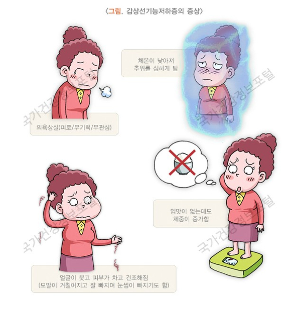 갑상샘기능저하증의 증상-피로, 무기력, 의욕상실-기억력, 집중력, 사고력저하-식욕저하, 반대로 체중은 증가-저체온증이나 추위에 강함-맥박이 느리고 피부가 거칠고 창백한-말리는 소리, 말을 더듬는-변비, 소화불량-생리불규칙 등 다양한 증상이 있습니다.만열이 올라 뜨거운 갑상샘 항진증과 비교해서 추위에 지고 기력이 없어 식욕이 떨어지지만 반대로 체중이 증가하는 현상이 나타나면 나이라고 생각하지 말고 검사를 받아보시는 것이 좋습니다.