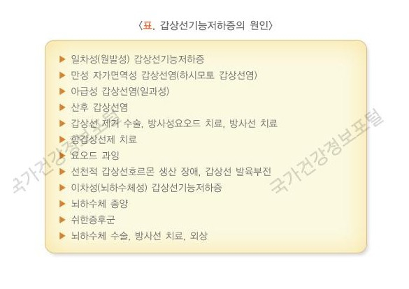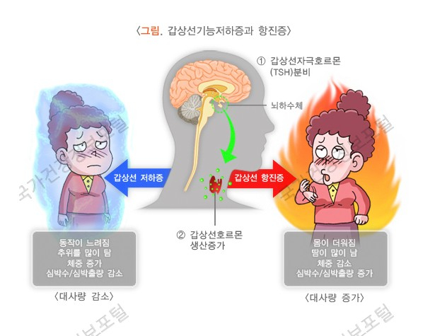 특히 중년 이상의 여성에게서 흔히 발생하는 질환입니다.갑상선이라는 목 부분에 위치하고 있습니다.갑상선 호르몬을 분비하는 내분비 기관입니다.이 갑상선 호르몬은 우리 몸에 많은 대사 운동을 하게 되는 것입니다.이 호르몬은 T3, T4의 형태로 되어 있는데, 일반적으로 T4 호르몬이 말초조직으로 가서 T3로 변환되어 몸 전체 세포의 산소를 소비열의 발생을 촉진하고 심장 근육의 수축과 이완을 조절하여 심박수를 높이고 LDL 콜레스테롤을 분해하여 산모의 경우 태아의 뇌발달, 골격근의 성숙에 도움을 주기 때문에 여성에게 흔한 질환인 반면, 그 역할이 중요합니다.대사를 활성화시키고 에너지를 발산하면서 스트레스를 조절하는 스트레스 호르몬이라고도 합니다.