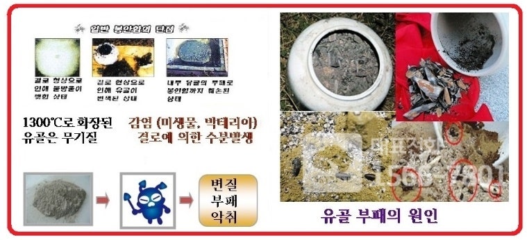화장된 고인의 유골은 신체의 일부이기 때문에 세월이 지나면 부패가 시작됩니다.결로현상에 의해 해충, 변색, 악취, 떡메치기 등입니다.