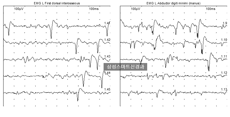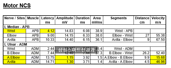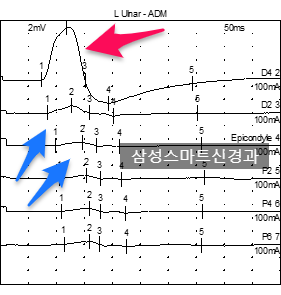 증상만 봐도 척골신경손상이 의심됩니다해당 환자의 신경전도 및 근전도 검사 소견입니다.