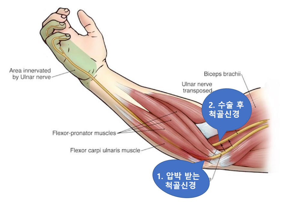 압박받는 신경의 (1) 위치에는 압박을 받지 않는 위치 (2)로 옮기는 수술을 실시합니다.수술을 한다고 해서 모든 증상이 좋아지는 것은 아닙니다. 신경손상이 심한 경우에는 모두 회복되지 않을 겁니다. 그래서 신경 손상이 악화되기 전에 정확하게 진단하고 치료하는 것이 좋아요.
