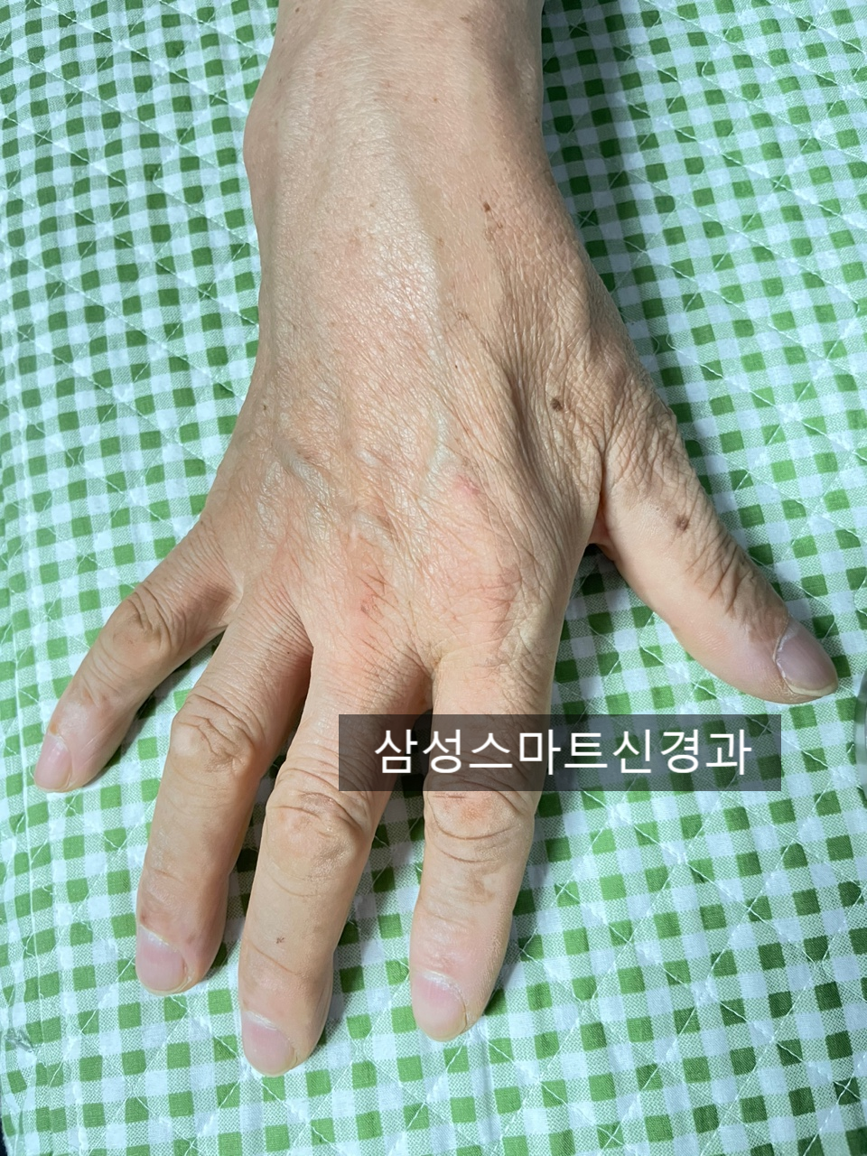 오늘 내원하신 한 환자의 손 모습입니다. 엄지 손가락과 검지 사이의 살이 빠져 있는 것으로 확인이 됩니다.힘을 측정해 보면 손가락을 구하는 힘이 감소하고 있고, 4-5 손가락을 구부리는 힘, 그리고 손목을 구부리는 힘이 감소하고 있습니다. 4-5 손가락 부분 및 손바닥 부분의 저림과 감각의 감소도 이야기 했습니다.