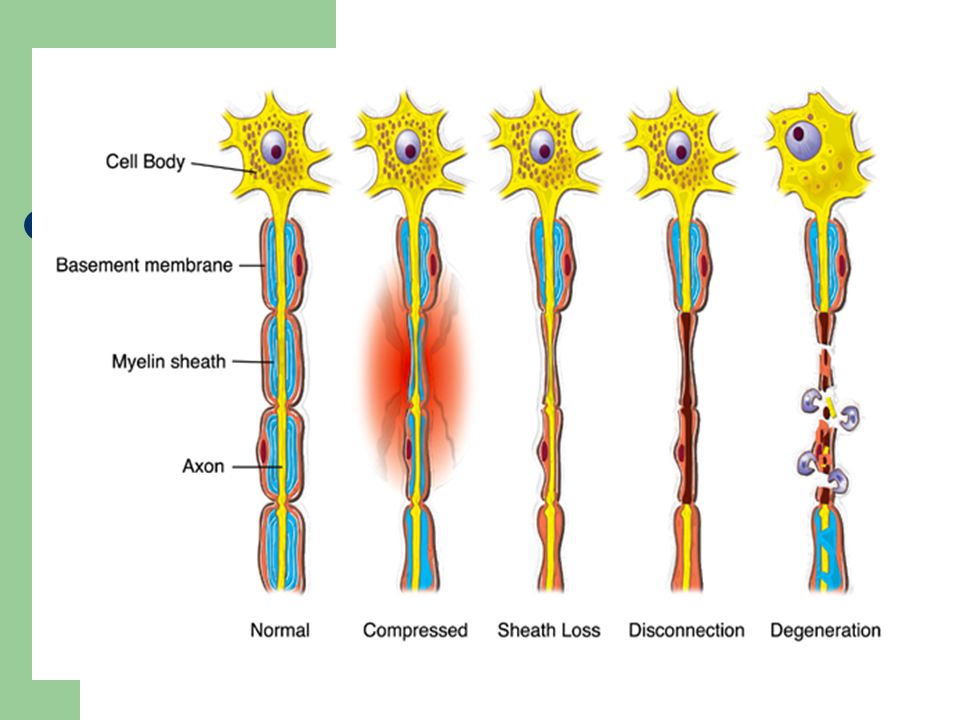 (왼쪽부터) 정상 – 신경압박 – 수초손상 – 신경사슬손상 – 신경퇴행