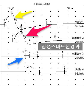 척골신경손상신경전도검사 결과 소견(1)(왼쪽)첫째와(노란색 화살표)두번째 그래프의 유발전위높이(빨간색 화살표)에 비해 세번째 그래프의 유발전위높이(파란색 화살표)가 매우 감소하고 있습니다. 자극의 위치는 오른쪽 그림에, 기록은 모두 작은 손가락으로 하고 있습니다. 1번 노랑, 2번 빨강색 위치에서의 자극은 정상이지만, 3번 파랑 지점에서의 자극은 이상하기 때문에 문제가 있는 부분은 팔꿈치 근처라는 것을 알 수 있습니다.