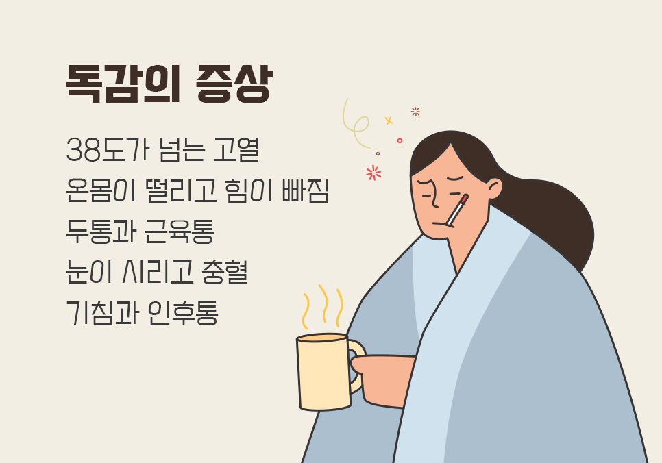 독감에 걸리면 38도가 넘는 고열이 나거나 온몸이 떨리고 힘이 빠지는 등 전신 증상이 심하게 나타납니다.두통이나 근육통 등의 증상을 동반하고 눈이 차가워져 충혈될 수도 있습니다. 기침이나 인후통 등 호흡기 증상을 동반하며 일반 감기보다 폐렴이나 천식과 같은 방법으로 이어질 가능성이 높습니다.