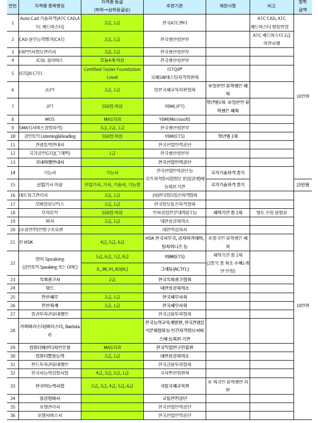 1.의 자격취득기간 : 2022.2.28.(월)~2022.12.31.(금)이 자격취득일(합격일 또는 발표일)에 재학생(수강신청이나 등록금 납부 왕려자) 신분인 경우나. 복학자의 경우 복학등록일과는 무관하며 복학학기 시작(개강) 이후 취득 건에 한함 ※ 단 수강신청 후 수업료 미납자의 경우 신청일 현재 등록 완료된 경우 인정