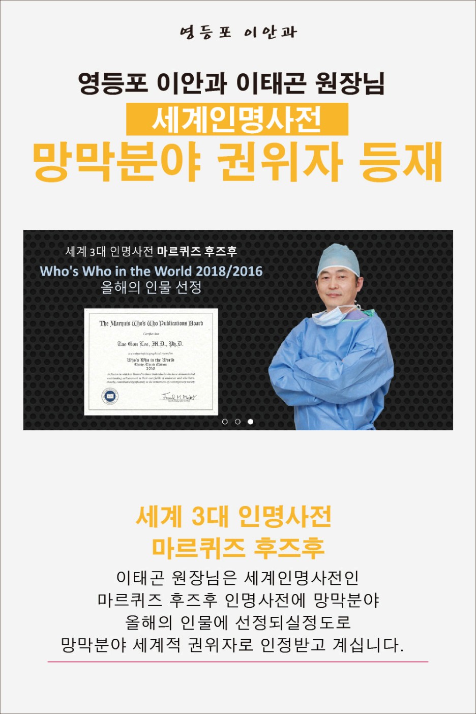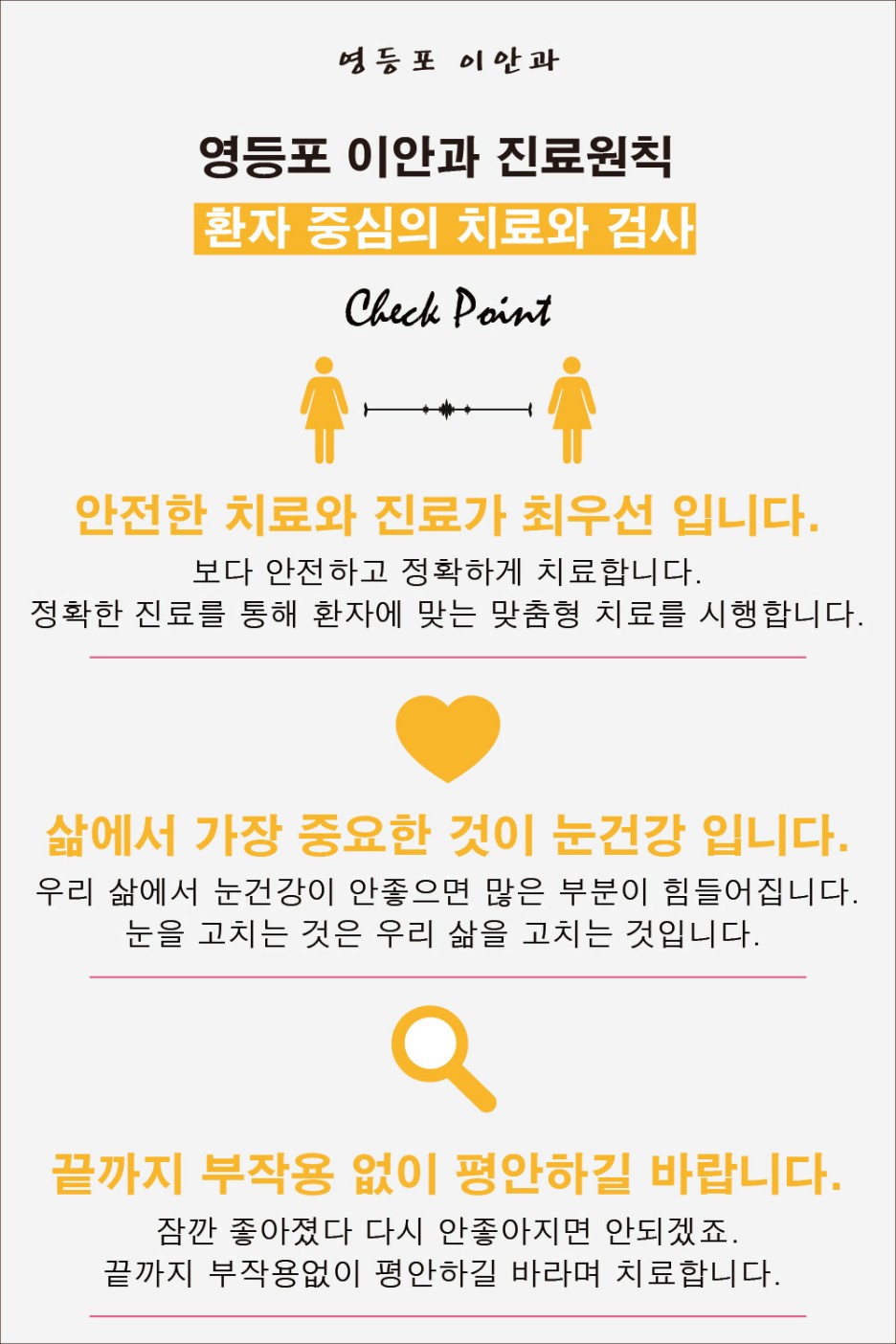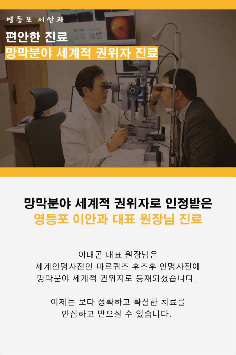 준비된 영등포 이안과 본원에는 녹내장 수술뿐만 아니라 망막질환을 예방 및 조기에 확인하고 치료할 수 있도록 정밀검진 장비를 구비하고 있어 좋은 예후를 기대할 수 있습니다. 뿐만 아니라 오랜 경력의 의료진이 1:1 맞춤진료를 실시하고 있어 일상생활로의 조기 복귀를 기대할 수 있어 시력저하와 같은 불편이 발생한다면 언제든지 도움이 되길 바랍니다.