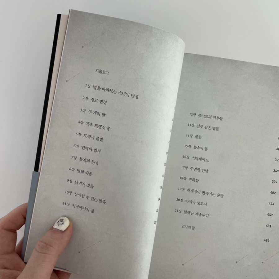 제1장_별을 바라보는 소녀의 탄생 제2장_경로변경 제3장_두 개의 달 제4장_계속되는 트랜짓 중 제5장_도착과 출발 제6장_인력의 법칙 제7장_통계의 문제 제8장_별의 죽음 제9장_남긴 것 제10장_상상할 수 없는 암흑 제11장_지구에서의 인생 제12장_콩코드의 미망인들 제13장_진주꽃놀이