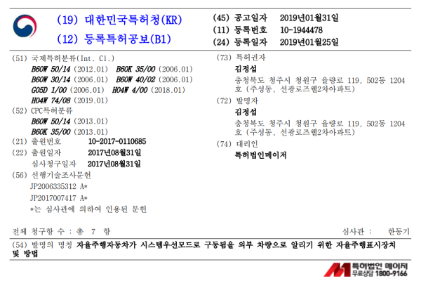 오늘의 메이저는!?안녕하세요~오늘 특허법인 메이저등록 사례는 충북 청주의 개인 고객이 의뢰해주신 자율주행표시장치입니다.