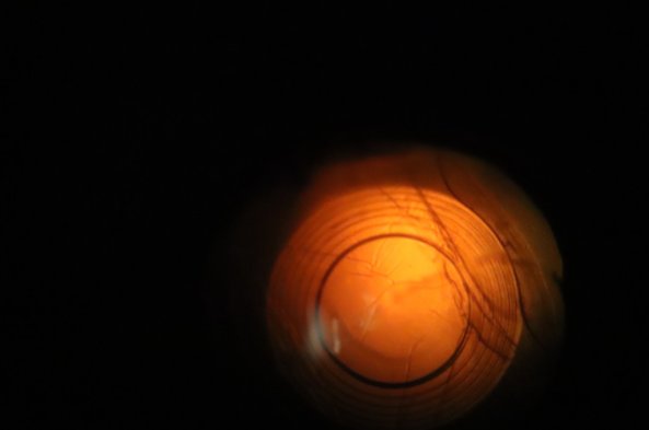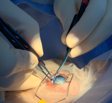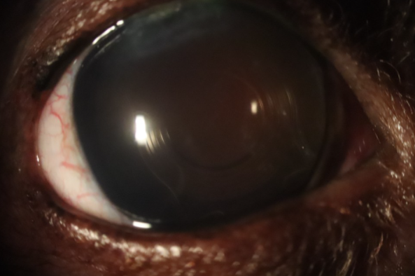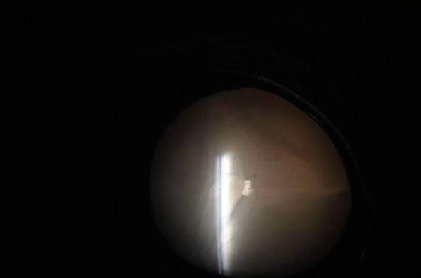 (백내장 수술 후 인공렌즈 삽입상태) 수술 시기는 수의사 안과 전문의와 상담 후 결정하십시오. 대부분은 백내장으로 인해 시력이 완전히 떨어지기 전에 수술을 받는 것이 좋습니다. 가장 중요한 것은 환자의 눈 상태뿐만 아니라 건강 상태와 전신 마취에 있어서의 위험 요소를 모두 고려하는 것입니다. 백내장 수술 절차는 매우 복잡하여 정밀한 미세 수술 기술이 필요하고 특수화된 수술 현미경과 정교한 미세 수술 기구를 이용한 작은 절개로 수술을 시행합니다.