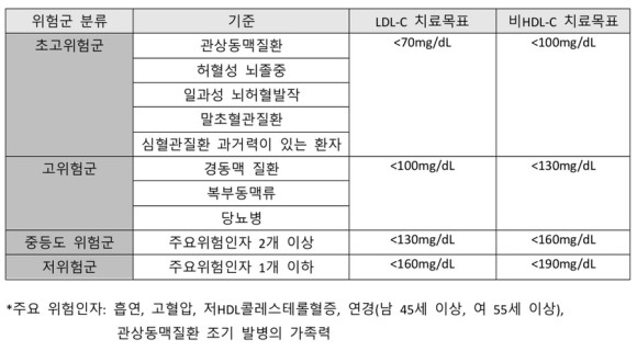 이상지질혈증 위험군 분류 및 치료목표 한국지질동맥경화학회에서 나온 이상지질혈증 치료지침에 따르면 개인이 보유한 질환이나 위험인자에 따라 초고위험군, 고위험군, 중등도 위험군, 저위험군으로 분류된다.
