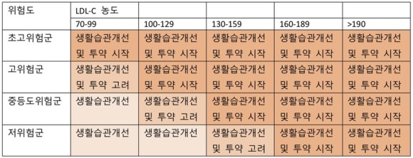 위험군에 따른 치료 전략의 첫 단계로 환자의 보유 질환 및 위험 인자에 따라 위험군을 4단계로 분류해 보았다. 2단계에서는 환자 위험군에 따른 혈중 LDL 농도에 맞춰 치료 전략을 세워야 한다.