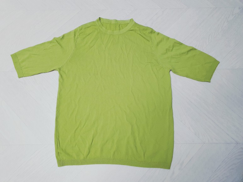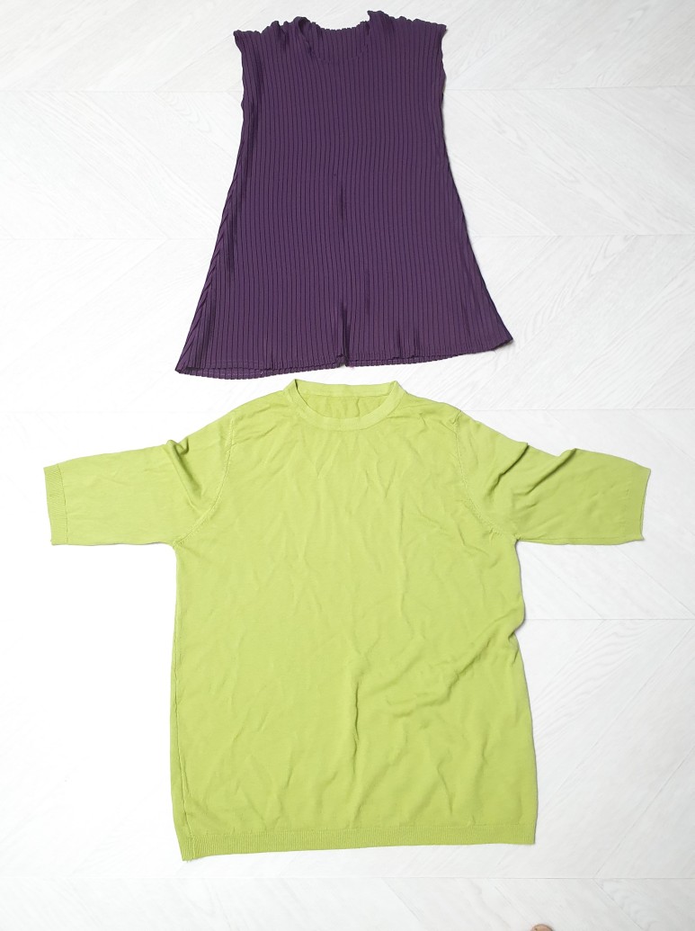 상 2개 먼저 후기를 올려보겠습니다~ 보라색 플리츠 민소매와 라임색보다는 약간 어두운 연두색입니다;)두 제품 모두 여름 제품이지만 연두 반팔은 간절기 착용하기 좋은 니트 소재입니다.
