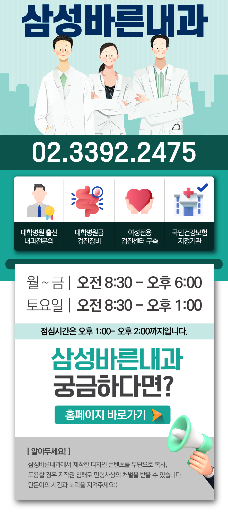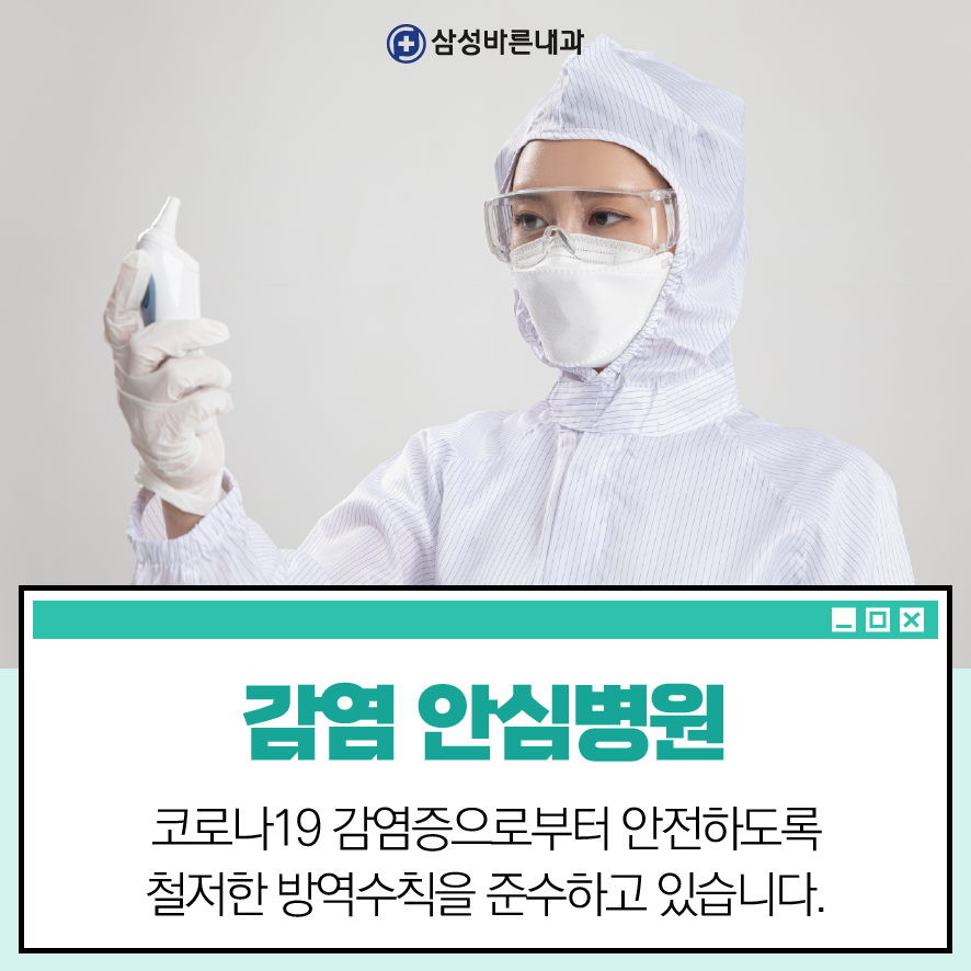 감염안심병원 노원내과 삼성정직한내과는 코로나19 감염으로부터 안전할 수 있도록 철저한 방역수칙을 지키고 있습니다. 코로나19 방역규칙에 따른 발열증상이 있을 경우 인근 선별진료소에서 음성판정을 받고 내원하세요.