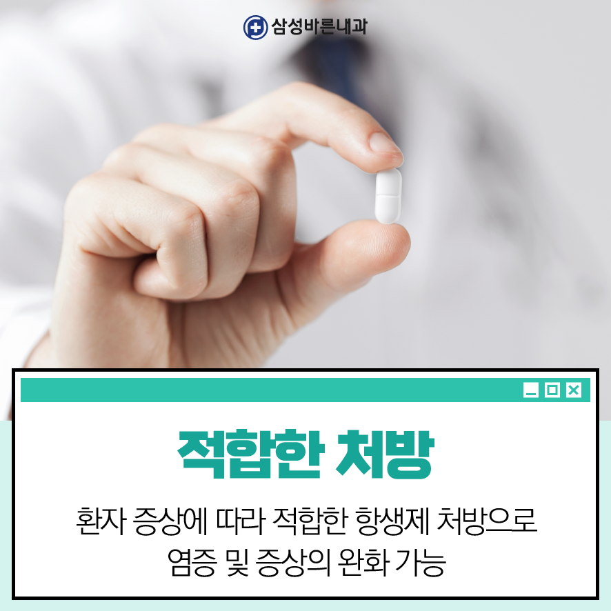 적합한 처방목이 심하게 부어 음식 섭취가 어려운 상태라면 탈수 증상을 예방하기 위해 수액 치료가 필요하며 환자의 증상에 따라 적합한 항생제 처방으로 염증 및 증상을 완화할 수 있습니다.