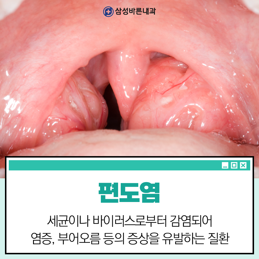 편도염은 세균이나 바이러스에서 감염되어 염증, 붓기 등의 증상을 유발하는 질환입니다.