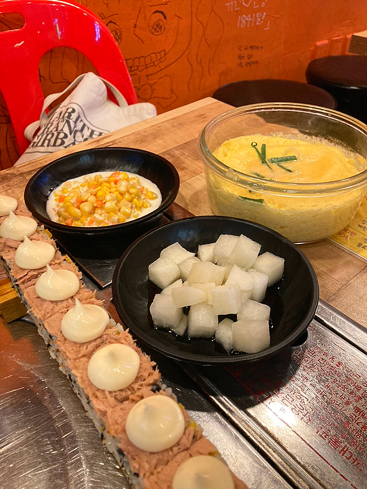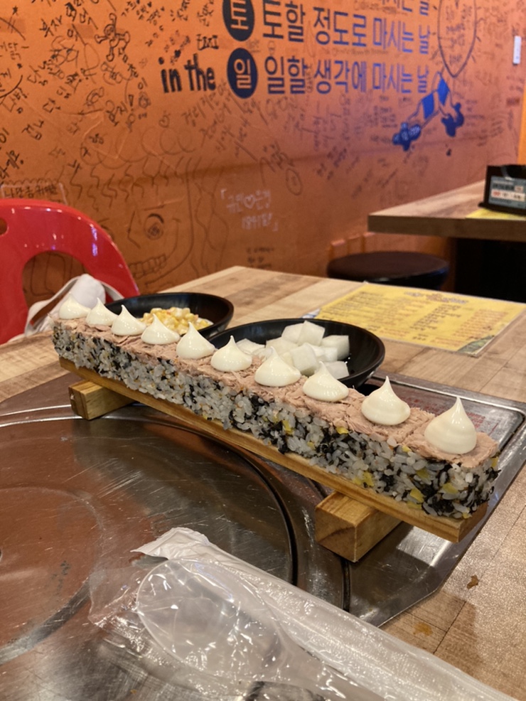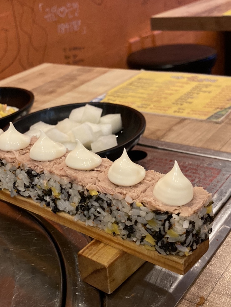 마요네즈가 위에 뿅 하는데 참치랑 마요네즈를 얘기하는 거야해밥과 짠 단무지가 더해져 닭발과 얼큰한 탕의 조합.