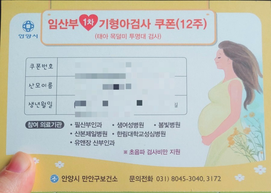 보건소에 가면 1, 2차 기형아 검사 쿠폰을 나눠줘서 도움이 됩니다.1차 기형아 검사 쿠폰은 초음파 검사비만 지원해 줘 약 2만원 절약할 수 있으며, 2차 기형아 검사는 쿼드 검사가 무료로 가능합니다.