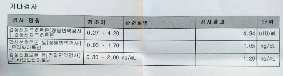 8주차 무렵 혈액검사 결과 갑상선 기능 저하가 나왔으나 남편의 지방출장을 함께 다녀 지방내과에서 갑상선약 처방을 위한 다양한 수치 확인을 위해 혈액검사를 다시 시행하였습니다.처음에는 산부인과에 갔는데 갑상선은 내과에서 검사하고 제가 다니던 병원은 큰 병원이었기 때문에 같은 건물에서 검사를 받을 수 있었습니다.갑상선자극호르몬(TSH) 정상 수치는 0.27~4.2uU/ml(병원마다 다르다고 합니다) 재검사 결과 정상치보다 약간 높은 4.9 정도로 내과에서는 이 정도는 약을 복용하지 않아도 된다고 안심했는데…