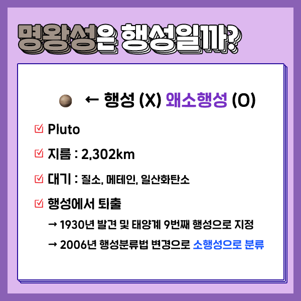 하지만 2006년 행성 분류법이 바뀌면서 명왕성은 소행성으로 분류됐습니다.그래서 명왕성은 행성이 아니라는 것! 꼭 기억하시면 좋을 것 같아요.(웃음)