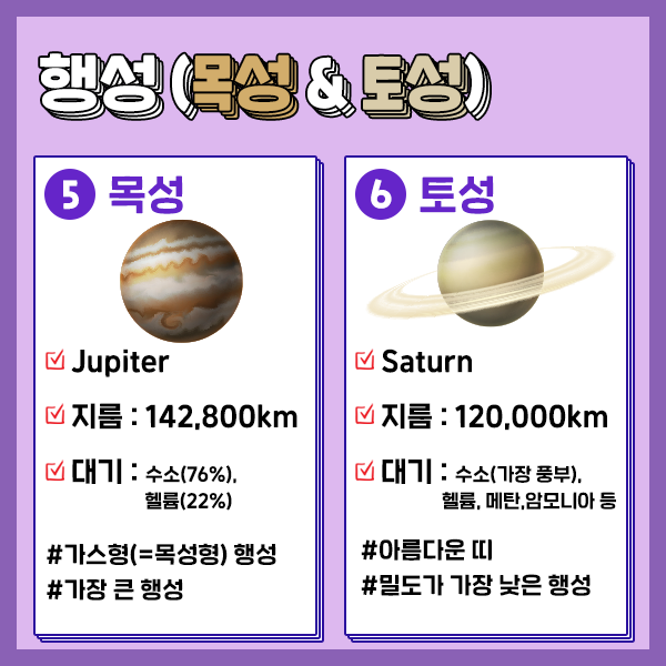 토성의 지름은 120,000km로 태양계에서 두 번째로 큰 행성입니다.하지만 물보다 낮은 밀도로 밀도는 태양계에서 가장 낮다고 합니다!
