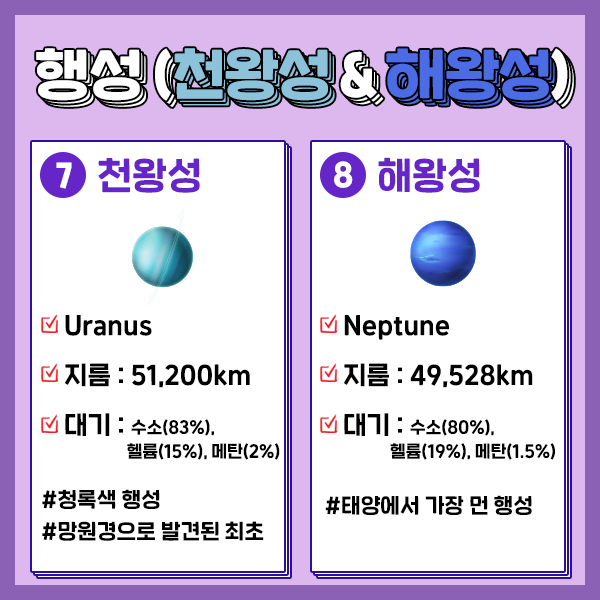 지름은 49,528km로 네 번째로 크고 대기구성분은 천왕성과 비슷합니다.태양에서 가장 멀리 떨어져 있는 행성이기도 해요!여기까지가 태양계의 8개의 행성이었습니다.그럼 명왕성이란 무엇일까? 수금지화목토천해명 아닌가? 이렇게 생각하시는 분들이 계실 거예요.