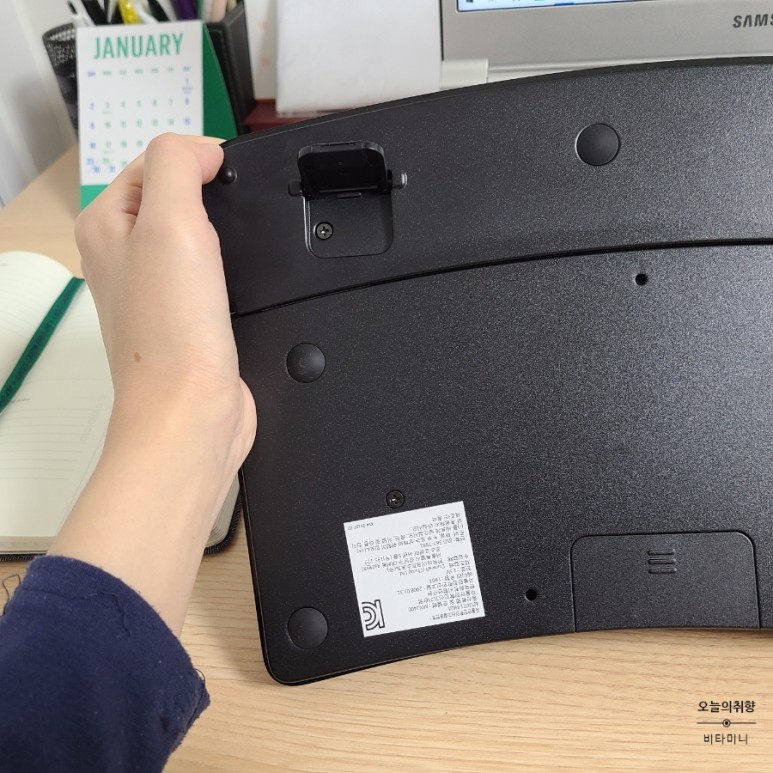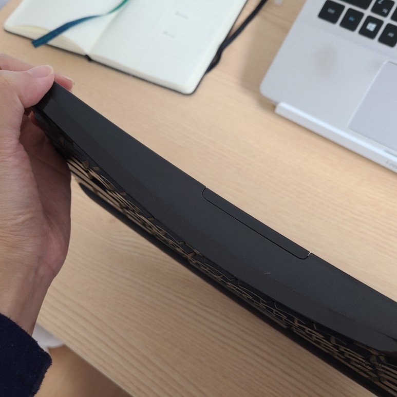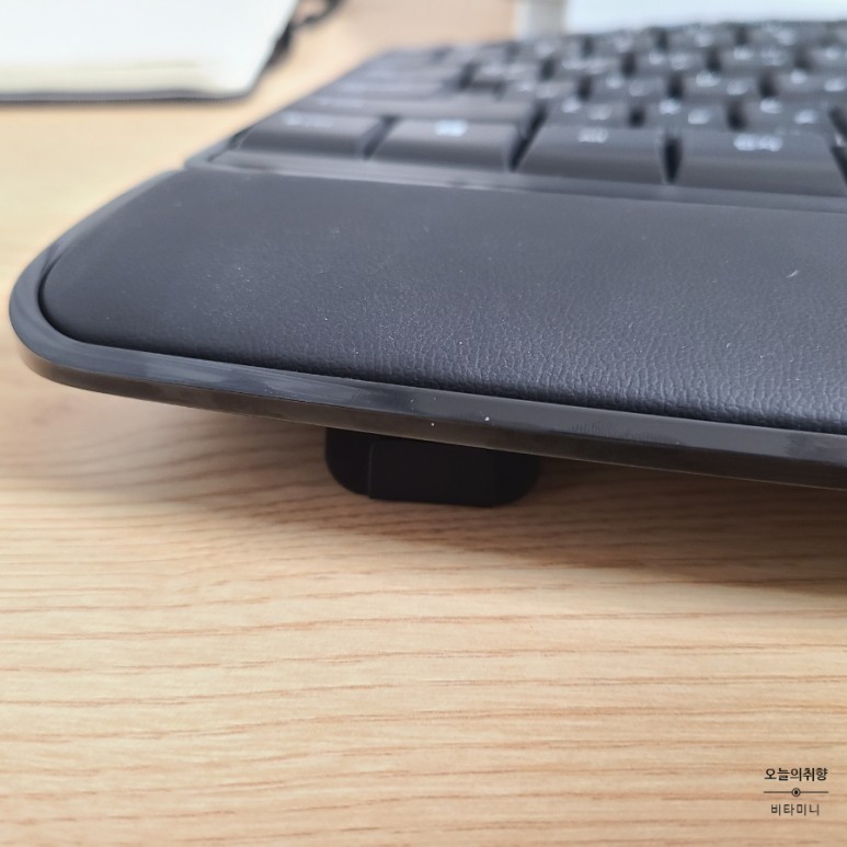처음에는 평평하게 썼지만 자세히 보면 키보드 하단에 이렇게 받침대가 있어 손목의 피로감을 줄일 수 있는 높이로 설정할 수 있다.