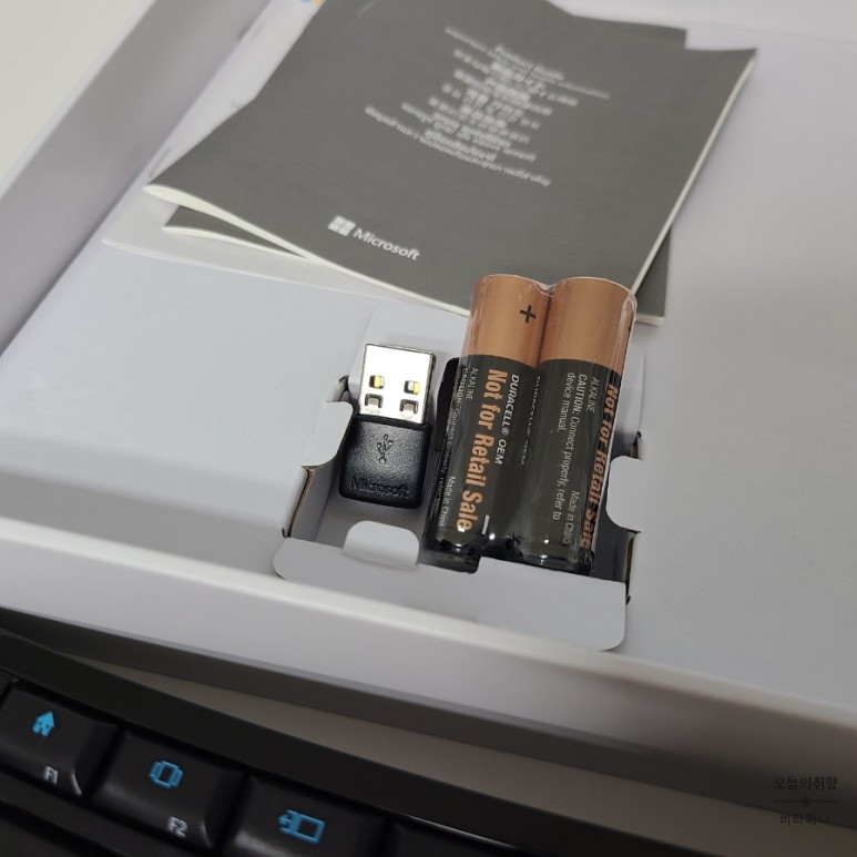 마우스와 키보드가 공유하는 무선 리시버와 마우스용 건전지가 동봉돼 있다.키보드 마우스는 이미 장착되어 있는 상태이다.