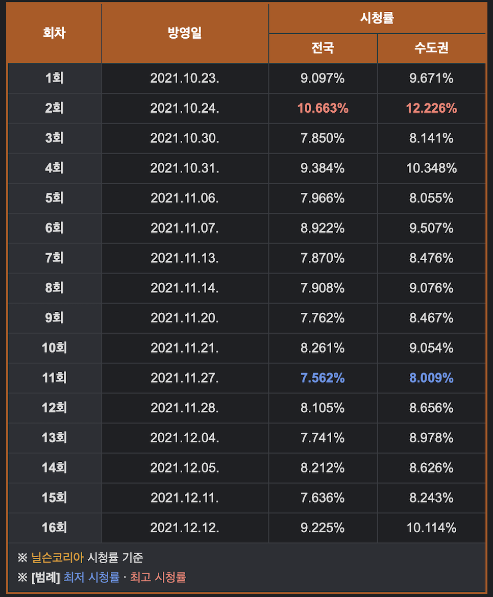 위에 지리산 시청률 그래프가 보이듯이 1화 때는 거의 10%에 가까운 수치를 보였고, 2화인 10월 24일에는 전국이 10% 달성 수도권은 12%를 달성했다. 하지만 이후 그 수치가 점차 낮아졌을 뿐 그래도 전반적으로 평균 7~8% 정도의 수치를 꾸준히 보여줬다. 막화는 10%.