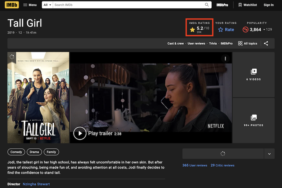 개인적으로 키 큰 여자분 너무 좋은데… 내가 키가 커서 그런지(187cm), 나는 키가 큰 게 더 좋다. 내가 목 밑으로 안 내려와도 되니까… 지금 자주 사귀는 그녀의 키는 160cm다. 나와 27cm 차이가 나는데 에스컬레이터에 올라갈 때도 그녀가 한 단계 더 올라간다 해도 내가 여전히 크다. 이번에 넷플릭스 하이틴 영화 하나 봤는데 키 큰 주인공 얘기였어. 근데 남자 입장에서는 큰 건 안 좋은 것 같고 여자 입장에서는 왜 이렇게 안 좋은 것 같은지. 사회 현실이 냉혹하기 짝이 없다. 이번 영화 리뷰문을 통해 대략적인 무비정보와 내용을 알아보자.