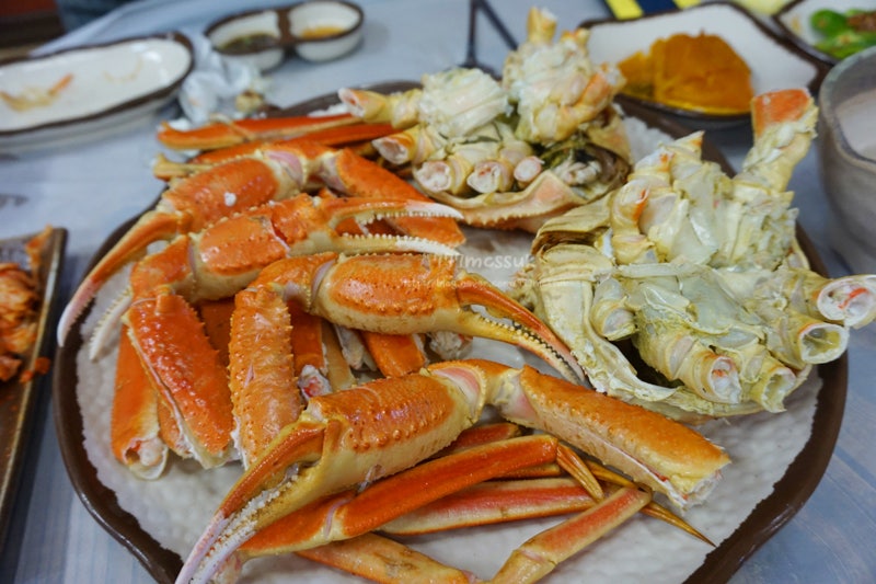 대게와 킹크랩의 kg당 가격은 시세에 따라 매일 달라집니다.이날 대게는 79,000원/킹크랩은 89,000원이었네요.친구 말로는 킹크랩 7킬로에 대게 3킬로를 예약했다고 합니다.보통 이 가게에서 판매하는 킹크랩 사이즈가 2kg이 넘는 큰 걸 판매하고 대게는 1kg 정도 되는 걸 판매한다고 하더라고요.기본 반찬이 세팅되었습니다.