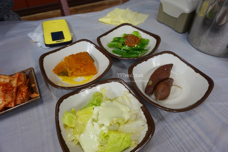 뭔가 되게 심플하고 부족한 느낌의 반찬… 여기서 다시 한번 실망했던 게.. 저번에 방문했을 때는 이렇게 불량이 아니었거든요.겨울에 방문하면 과메기도 주고 그 외에도 다양한 종류의 반찬과 사이드 메뉴가 가득 찼는데… 실망스러웠어요. 그리고 통영에 사는 친구가 한 달 전에 여기서 어머니 환갑잔치를 했다는데 그때도 이렇게 나왔대요.