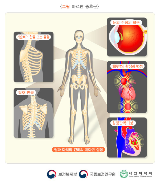 척추측만증, 승모판막탈출증, 대동맥류 등이 흔한 문제로 폐나 눈, 심장, 혈관 등에 다양한 이상이 생겨