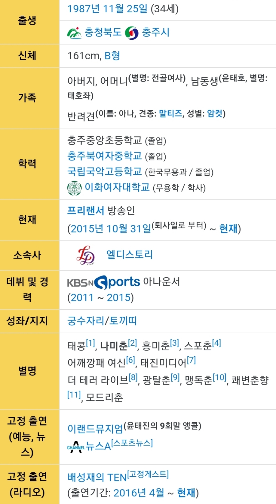윤태진 아나운서 프로필 나이키 학교 가족