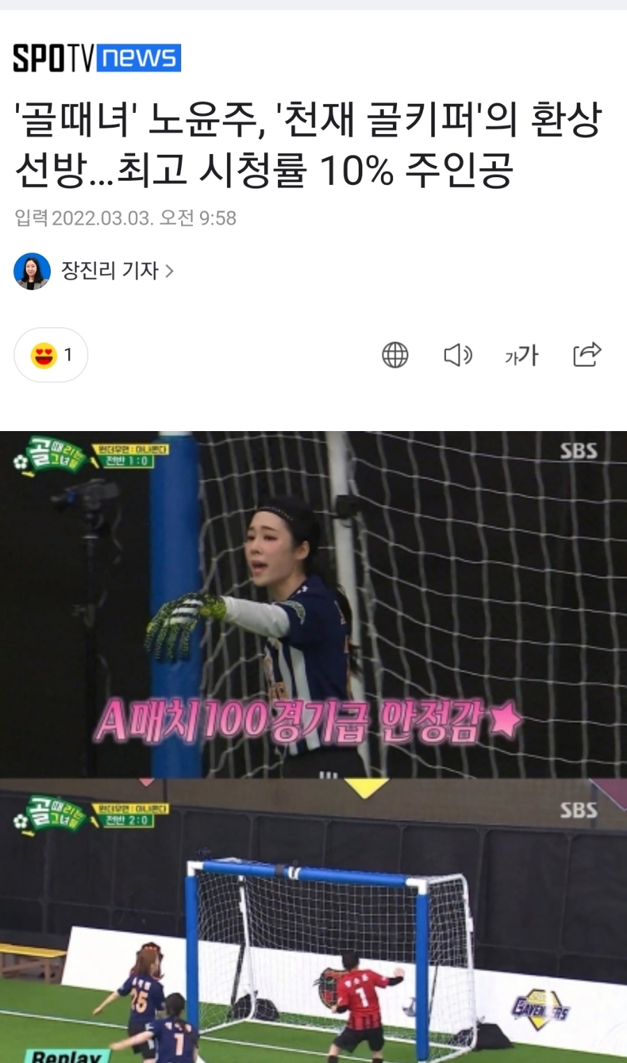 골키퍼 노윤주의 활약도 빛났지만 노윤주의 정확한 태클… 분당 최고 시청률 10%를 기록, 최고의 1분을 차지한다.