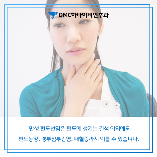 이렇게 급성 편도선염을 오랫동안 방치하거나 재발이 많은 경우에 만성 편도선염에 걸리게 됩니다. 만성 편도선염으로 발전하면 편도에 생기는 결석 이외에도 편도 부위에 농양이 발생하거나 경부 심부의 감염, 그리고 패혈증까지 생길 수 있는 다양한 합병증이 발생하기도 하므로 주의가 필요합니다. 급성 편도선염을 1년에 3회 이상 앓는 환자의 경우 만성 편도선염으로 의심됩니다. 위와 같은 사항에 해당하는 분은 반드시 이비인후과에 방문하여 진단 후 적절한 치료를 받으시기 바랍니다.