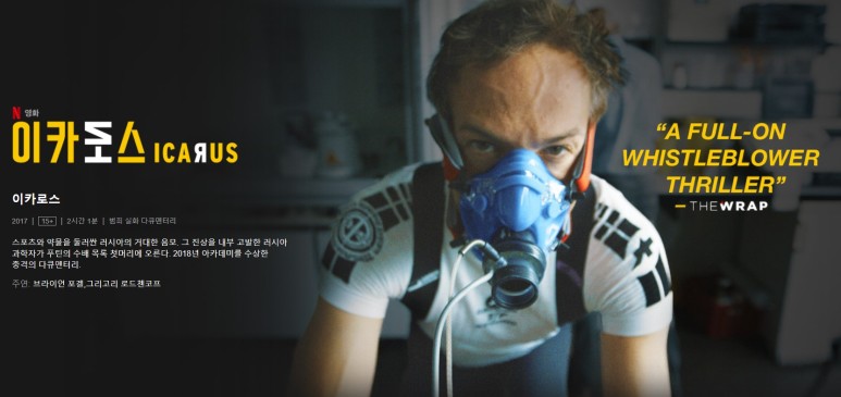 OTT 채널 넥플릭스에서 방영 중인 이카로스(ICARUS)는 2017년 제작된 다큐멘터리이다. 감독은 브라이언 포겔. 감독은 영화감독이자 프로듀서, 작가, 극작가 그리고 인권운동에도 참여하고 있다.