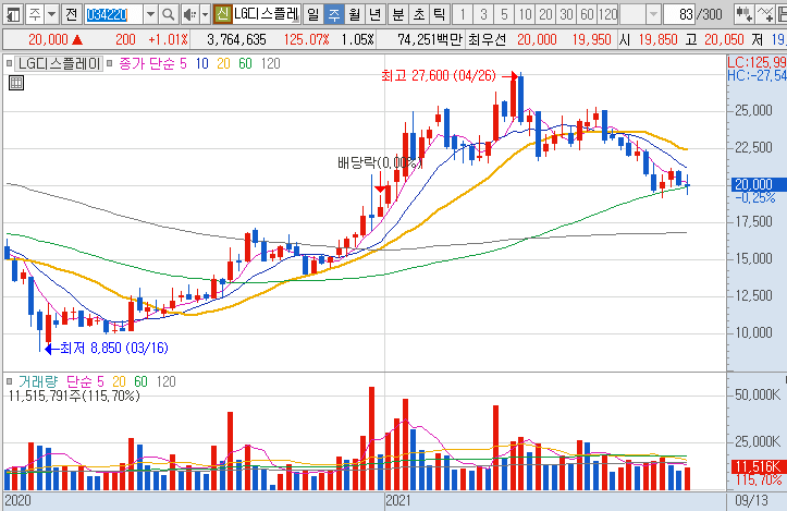 1년 전보다 약 14% 상승하며 초반 12,000원대에서 2만원대까지 치솟았지만 지난해 4분기 실적 실망감으로 하락세를 이어가고 있습니다.2019년 4분기 매출이 전년 동기 대비 1.9% 하락했고 영업이익도 91.7% 감소했습니다. 그 원인으로 아이폰 수요는 긍정적이지만 판매 믹스가 문제이고 아이폰 12 프로에 사용되는 멀티 FPCS가 5.4인치, 6.7인치 모델에 사용되는 RF-PCB 대비 단가 및 수익성이 낮아 많이 팔려도 수익이 증가하지 않는 기이한 현상이 발생했습니다. 앞으로 하반기에는 모든 신모델에 RF-PCB가 적용되면 수익성 회복을 예상으로 기대할 수 있을지 한번 지켜봐야 할 부분이네요.