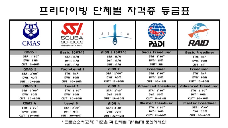 Aida 1(Basic Freediver) ↓Aida 2(Freediver) ↓Aida 3(Advanced Freediver) ↓Aida 4(Master Freediver) 순인데요~AIDA는 숫자로 등급을 표현하고 숫자가 올라갈수록 높은 등급이에요! 셋째, CMAS~! (크리스마스 줄임말이 아닙니다) (Conferderation Mondialdes Activities Subaquatiques) 세계수중활동연맹의 프랑스어 줄임말세계아수족활동연맹Discovery Freediver↓CMAS1↓CMAS2↓CMAS3번이 되겠습니다~! 넷째~!SSI(Scuba Schools International)의 줄임말 스쿠버 단체에서 프리다이빙을 2011년도에 런칭하여 전세계적으로 사랑받는 단체로 급성장합니다.스쿠버 스쿨 인터내셔널Pool Freediver↓Level 1↓Level 2↓Level 3순입니다~! 다섯번째, 마지막에 RAID가 됩니다!(Rebreather Association of International Divers)의 줄임말인 히스토리가 조금 재미있습니다.SSI가 Mares라는 다이빙 용품 제조업체에 판매되면서 기존 SSI와 AIDA 주요 멤버들이 창립한 것이 RAID가 됩니다.SSI 프리다이빙 트레이닝 디렉터이자 호주 챔피언이자 세계 기록 보유자인 마이크 웰스(Mike Wells)가 RAID로 최신 프리다이빙 교육 시스템을 구축하게 됩니다.첫머리가 길었어요~!레벨을 보면Basic Freediver↓Freediver↓Advanced Freediver↓Master Freediver순서가 되겠습니다.PADIと同じですね。^_^ 대부분의 #프리다이빙 자격증은 단체별로 각각 4가지 수준으로 기본적으로 구분되어 있습니다.근데~! 레벨별 기준이 어떻게 되는지 궁금하시죠~?마지막으로 이것만 볼게요.Basic Freediver↓Freediver↓Advanced Freediver↓Master Freediver순서가 되겠습니다.PADIと同じですね。^_^ 대부분의 #프리다이빙 자격증은 단체별로 각각 4가지 수준으로 기본적으로 구분되어 있습니다.근데~! 레벨별 기준이 어떻게 되는지 궁금하시죠~?마지막으로 이것만 볼게요.엑셀로 정리해봤어요~!STA(Static Apnea):수면에서 숨을 참는 시간 DYN(Dynamic Apnea With Fins):핀을 신고 수평으로 잠영한 거리(DNF는 핀 없이 수평으로 잠영한 거리)*CWT(Constant Weight With Fins):핀을 신고 수직으로 깊게 잠수한 거리입니다. 그리고 정말 마지막으로~! 단체마다 비슷한 레벨은 크로스오버, 즉 단체교체가 가능하기 때문에 다음 단계에서는 다른 단체자격증으로 획등 가능합니다.(자세한 것은 강사님께 여쭤보세요.) (웃음) 이상 프리다이빙 자격증에 대해 알아봤습니다.역시 다이빙 용품은 어디서 사?도매유통전문 #브랜드오션~~클릭↓↓↓↓↓↓글로벌 스포츠브랜드 병행수입 전문업체Brandocean – 브랜드 오션 B2B 도매(주) 브랜드 오션 B2B 사이트입니다. 글로벌 스포츠 브랜드 병행 수입, 도매, 유통, 위탁, 매입, 소매 전문 회사입니다.www.brand-ocean.comBrandocean – 브랜드 오션 B2B 도매(주) 브랜드 오션 B2B 사이트입니다. 글로벌 스포츠 브랜드 병행 수입, 도매, 유통, 위탁, 매입, 소매 전문 회사입니다.www.brand-ocean.comBrandocean – 브랜드 오션 B2B 도매(주) 브랜드 오션 B2B 사이트입니다. 글로벌 스포츠 브랜드 병행 수입, 도매, 유통, 위탁, 매입, 소매 전문 회사입니다.www.brand-ocean.com