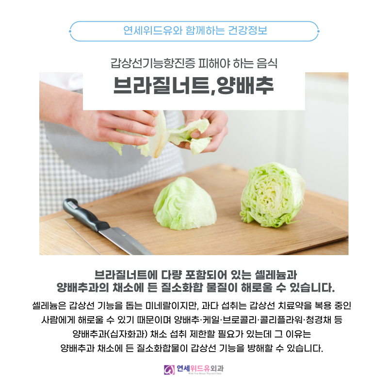 양배추·케일·브로콜리·컬리플라워·청도라지 등의 양배추과(십자화과) 야채의 섭취도 제한할 필요가 있는데 그 이유는 양배추과 야채에 포함되는 질소화합물이 갑상선 기능을 방해할 가능성이 있습니다.
