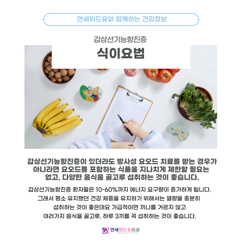 갑상선은 우리 몸의 대사와 관련된 기능을 하고 있고 이상이 있으면 평소의 생활 습관 중에서도 꾸준한 관리가 필요합니다.