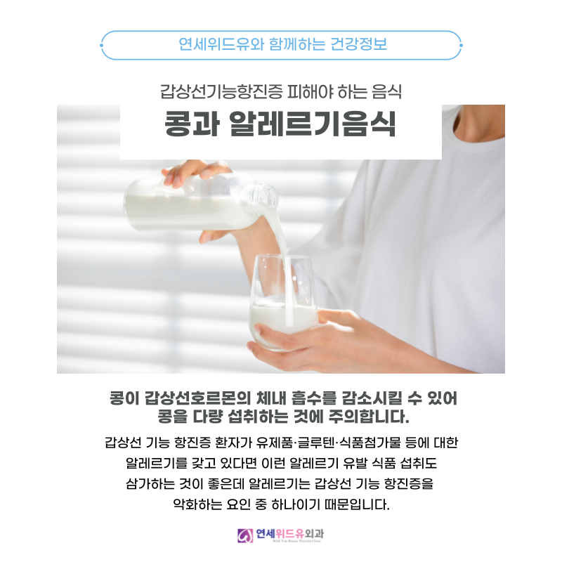 갑상샘기능항진증환자가 유제품, 글루텐, 식품첨가물 등에 대한 알레르기를 갖고 있다면 이러한 알레르기 유발식품의 섭취도 삼가는 것이 좋지만 알레르기는 갑상샘기능항진증을 악화시키는 요인 중 하나이기 때문입니다.