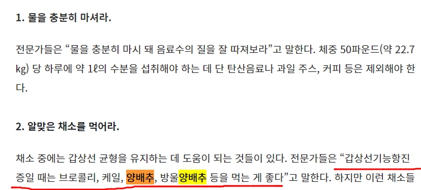 이 양배추는 위에서 설명한 브로콜리와 함께 드시면 시너지 효과로 더욱 효능을 높일 수 있기 때문에 함께 드시면 도움이 됩니다.이렇게 갑상선에 좋은 음식, 다양한 종류와 발생원인 등에 도움이 되는 내용을 살펴보았습니다.특히 갑상선암은 완치율이나 생존율이 높은 편이기 때문에 소홀히 하지 말고 미리 조심하면 관리가 편할 것입니다.아무리 좋은 음식이라도 꼭 먹는 것보다는 어떤 부분에 도움이 되는지 알고 섭취하는 것이 좋으므로 이러한 건강정보를 미리 알고 관리에 유의하시기 바랍니다.