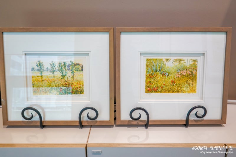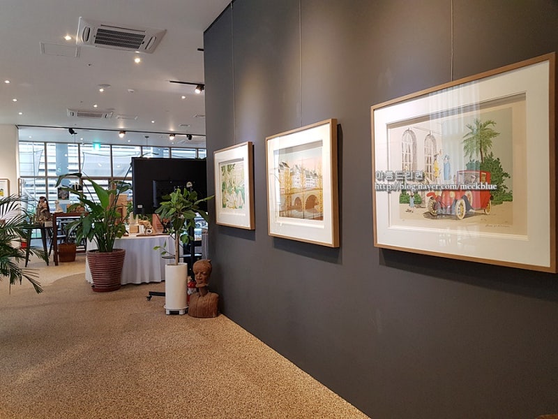 #카페노엘 입구에 들어가면 갤러리 카페답게 이렇게 그림이 전시되어 있고 안으로 들어가면 아주 큰 매장이 나옵니다.가끔 그림 경매도 한다고 들은 적이 있어요.그림은 가끔 바뀌는 것 같아요.내가 방문했을 때도 그림을 몇 점 교환해서 전시하고 있었어요.