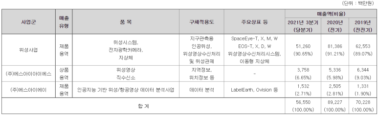 매출의 90% 이상이 위성 사업에서 발생하고 있으며, 대한민국 우주 산업 연합군인 스페이스 허브에 포함되어 있는 기업이기도 합니다.