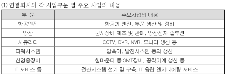 항공기 및 가스터빈 엔진, 자주포, 장갑차, CCTV, 칩마운트 등의 생산 및 판매와 IT 기술을 활용한 서비스 제공을 주요 사업으로 영위하고 있으며, 기업의 모체는 방위산업이며 우주항공, 항공엔진과 밀접하게 관련되어 있습니다.