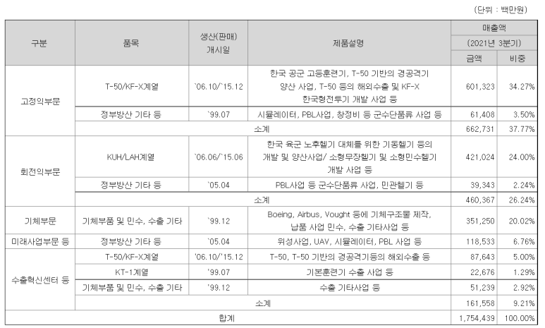 한국 항공 우주와 종속 회사는 항공기, 우주선, 위성체, 발사체 및 부품의 설계, 제조, 판매, 정비 등의 사업을 하고 있으며 군수사업의 대부분은 내수로 구성되어 수요자인 한국 정부(방위사업청)와 계약을 통해 제품(군용기)의 연구개발, 생산, 성능개량, 후속지원 등을 하고 있습니다.