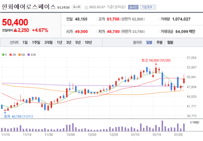 02/07 주가:50,400원 시가총액:2조5,518억원 동사는 1977년 8월 1일 설립되어 1987년 5월 27일 유가증권시장에 상장하였으며 2018년 3월 23일 한화에어로스페이스 주식회사로 상호를 변경하였습니다.