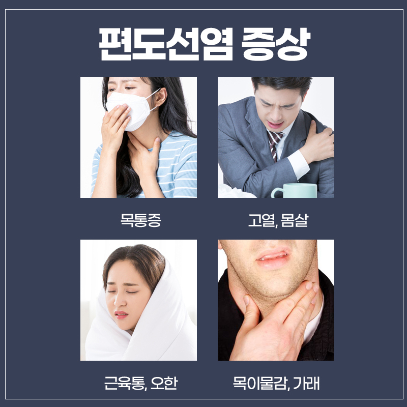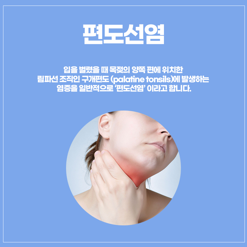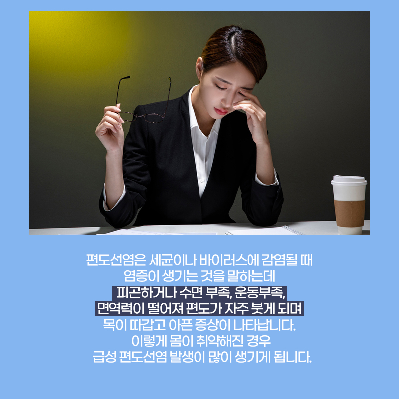 편도선염은 세균이나 바이러스에 감염되었을 때 염증이 생기는 것을 말하는데, 피곤하거나 수면 부족, 운동 부족, 면역력이 떨어져 편도가 붓거나 목이 아픈 증상이 나타납니다.이렇게 몸이 약해진 경우 급성 편도선염이 많이 발생합니다.