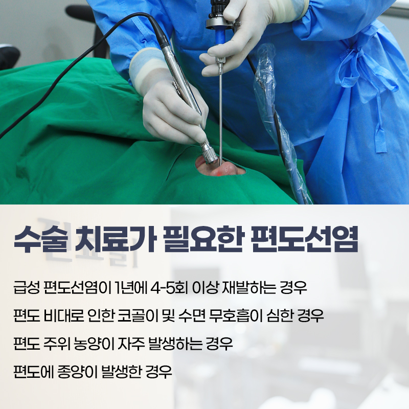 다른 치료법을 충분히 했는데도 1년에 4~5회 이상 재발할 경우 편도절제술을 할 수 있어요안면골 발달의 문제가 생길 때 편도 비대증이 심하여 코골이 및 수면 무호흡증을 일으키는 경우, 편도선 주위에 농양이 자주 발생하는 경우, 편도에 종양이 발생하는 경우, 난청을 유발하는 삼출성 중이염이 재발하는 경우 수술을 권장합니다.수술을 결정할 때에는 환자의 상태와 여러 가지 연건을 충분히 상담과 검사를 통해 확인하고 판단하여 치료방법을 찾는 것이 우선입니다.